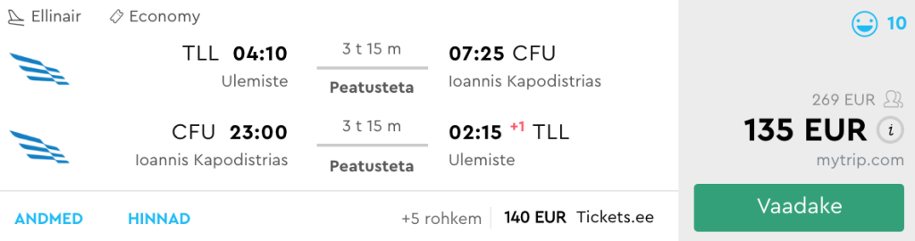 Lennufirma Ellinair pakub hetkel hea hinnaga viimase hetke lennupileteid Korfu saarele. Edasi-tagasi lennupiletid otselendudele Tallinnast Korfu saarele on saadaval vaid 135€ eest. Saadaval on soodsad lennupiletid vahemikuks 09.09-19.09 (10 ööd). Lennupiletite hinna sees sisaldub nii toitlustamine lennuki pardal kui ka äraantav pagas. Osta lennupiletid [SIIT](http://tc.tradetracker.net/?c=28199&m=12&a=292481&u=%2Fflight-search%2FTLL-CFU%2F2018-09-09%2F2018-09-19%2F2adults%3Fsort%3Dprice_a)Ilmaennustus tulevaks nädalaks Korful: