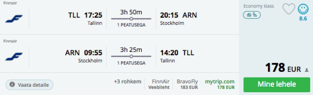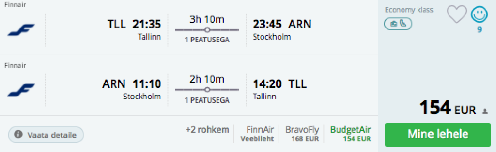 ####LENNUPILETID MEHHIKOSSEKuna sobival ajal 24.02 lendu Tallinnast Arlanda lennujaama ei ole, siis tuleks päev varem kohale minna ning öö lennujaamas veeta.