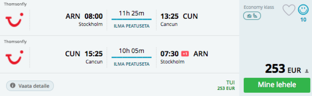 TUI on hetkel pakkumas väga hea hinnaga viimase hetke lennupileteid Stockholmist nii Mehhikosse, Cancuni kui Dominikaani Vabariiki (Puerto Plata ja Punta Cana). Väljumised on juba lähipäevadel. Otsisime välja ka sobivad lennud Tallinnast Stockholmi. Soodsaima hinnaga majutuse omale huvipakkuvas sihtkohas leiad läbi hotellihindade võrdlusportaali Hotelscombined.ee ning rendiauto läbi Rentalcars.com