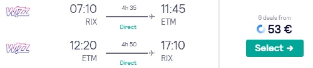 Odavlennufirma Wizzair pakub hea hinnaga lennupileteid Riiast Punase mere äärsesse Eilatisse. Edasi-tagasi lennupiletid on Riiast uude Eilati Ramoni lennujaama on saadaval alates 53€ eest. Lennud toimuvad 2x nädalas, esmaspäeviti ja reedeti. Huvi korral saab Eilatist edasi minna ka Egiptusesse, selle kohta leiab infot otsides Tripi foorumist. Endale sobivaid lennukuupäevi kontrolli läbi Skyscanneri või kliki allpool olevatel näidiskuupäevadel.