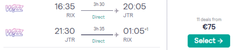 Wizz Air pakub hetkel väga hea hinnaga lennupileteid viimastele otselendudele Riiast Santorinile. Edasi-tagasi lennupiletid on saadaval alates 75€ eest ning lennupileteid leiab kuni augusti lõpuks-septembri alguseks. Lennud Wizz Airiga Riia ning Santorini vahel toimuvad 1x nädalas laupäeviti. Piletiteni jõudmiseks kliki allpool olevatel näidiskuupäevadel või kontrolli endale sobivaid lennukuupäevi läbi Skyscanneri.