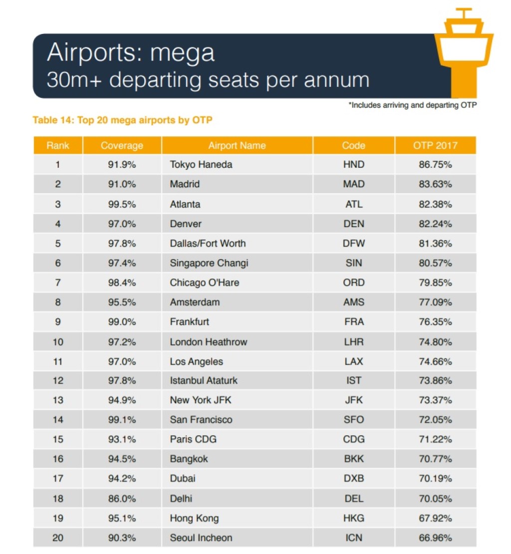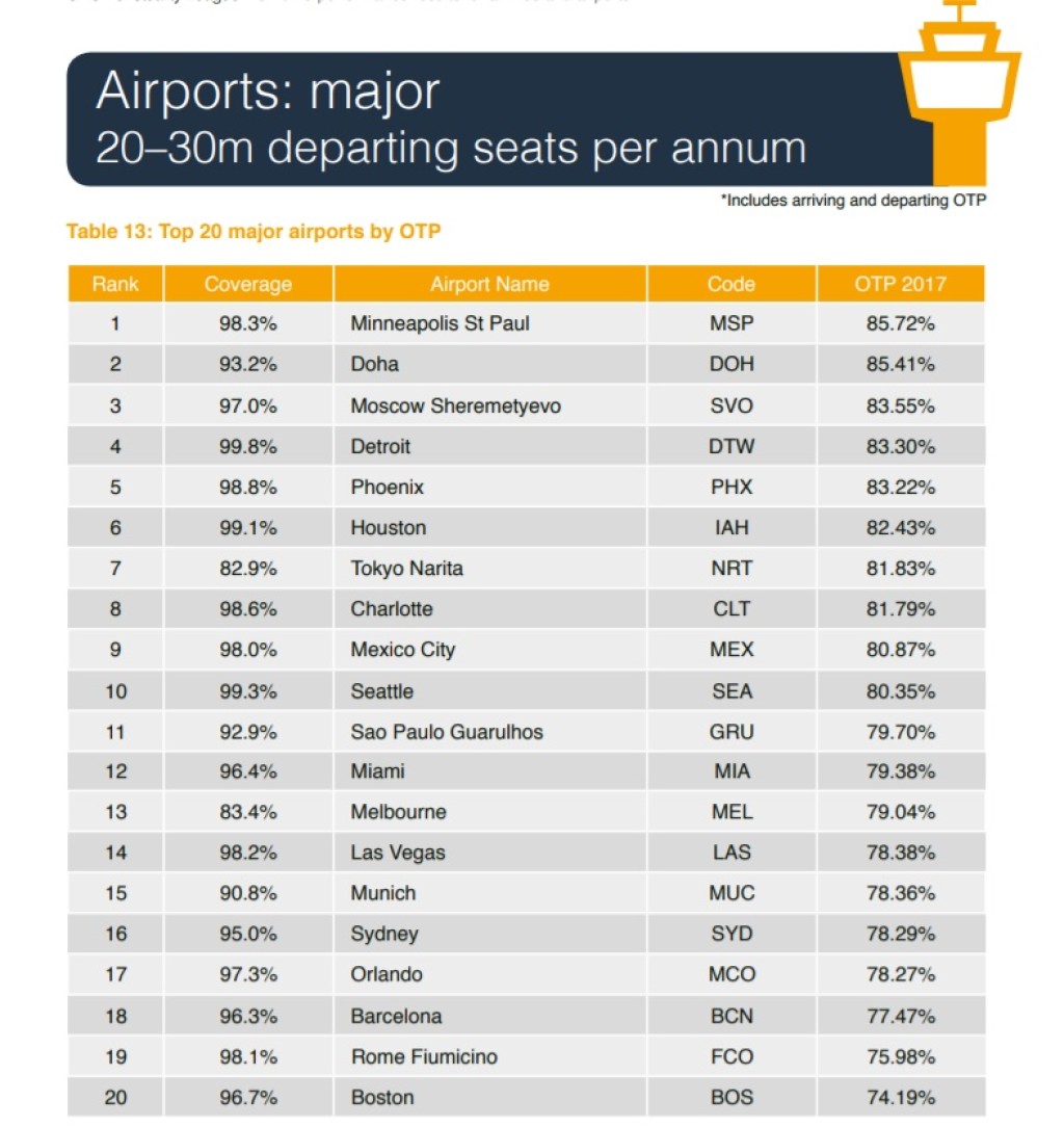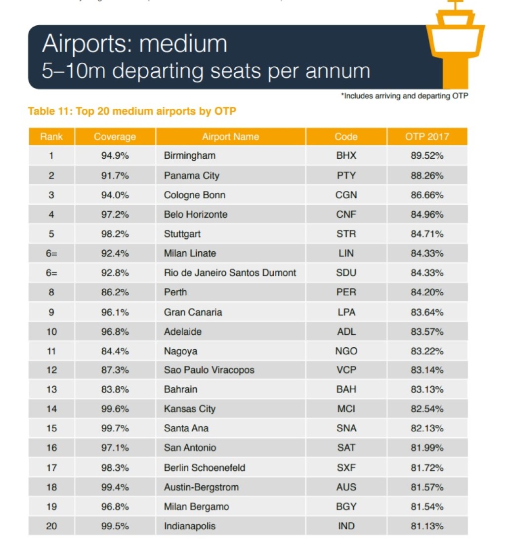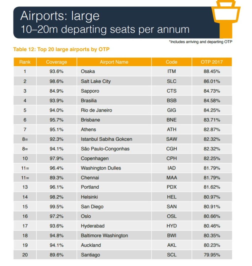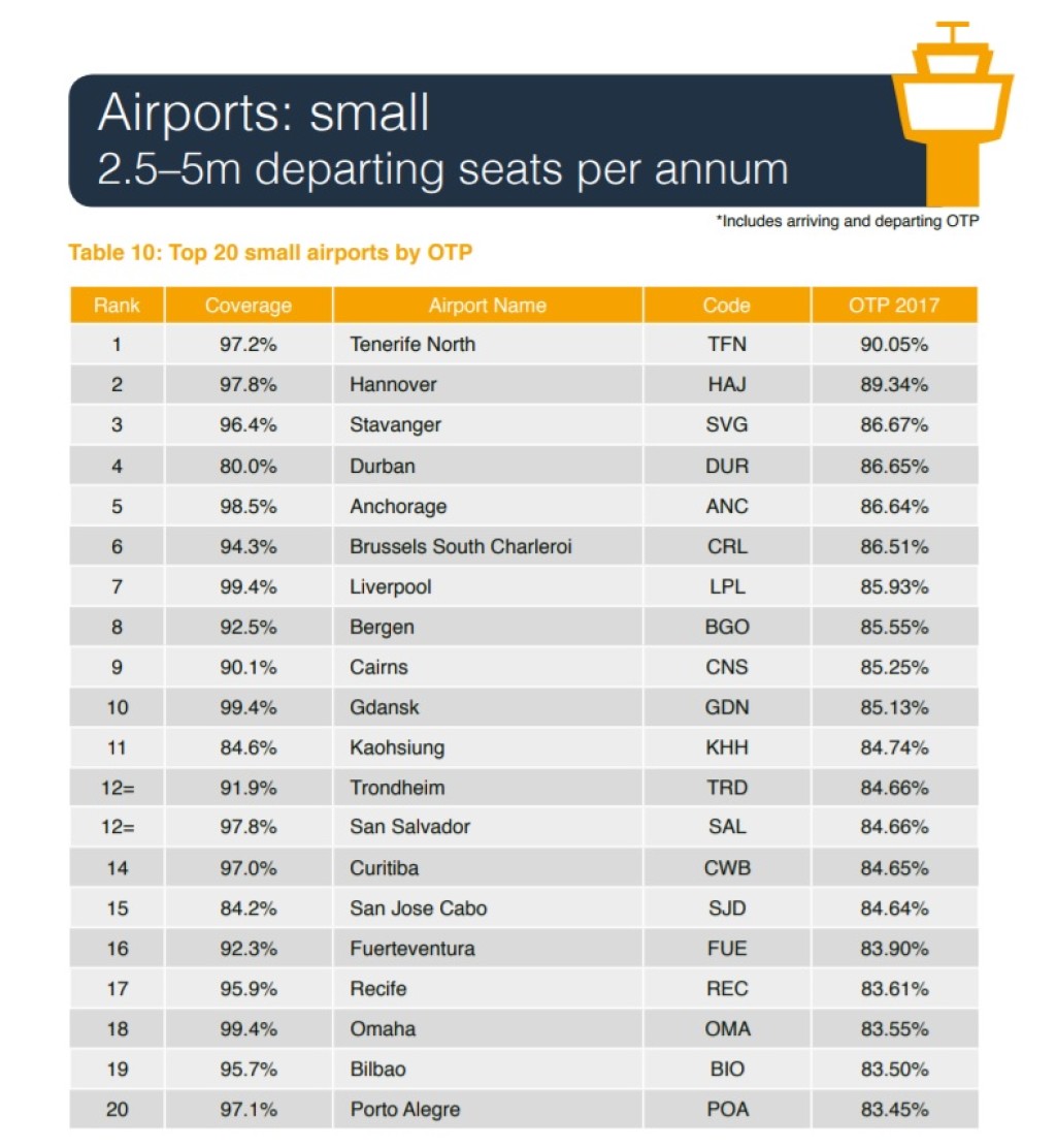 Lennujaamasid on veidi raskem võrrelda, sest vahepeal on kuni 10 miljoni reisijaga lennujaamad jagunenud kahte kategooriasse (2,5-5 miljonit ja 5-10 miljonit). Kui 2015. aastal oli maailma täpseim lennujaam Osaka Kansai lennujaam 93,85 protsendiga, siis sel aastal on sama lennufirma punktuaalsus 88,45%. Esikohalt leiame Tenerife North lennuvälja 90,05 %-ga. See oli ka ainus lennujaam, kus täpsuse protsendid üle 90 ulatusid. 2 aastat tagasi oli selliseid lennujaamu 7.