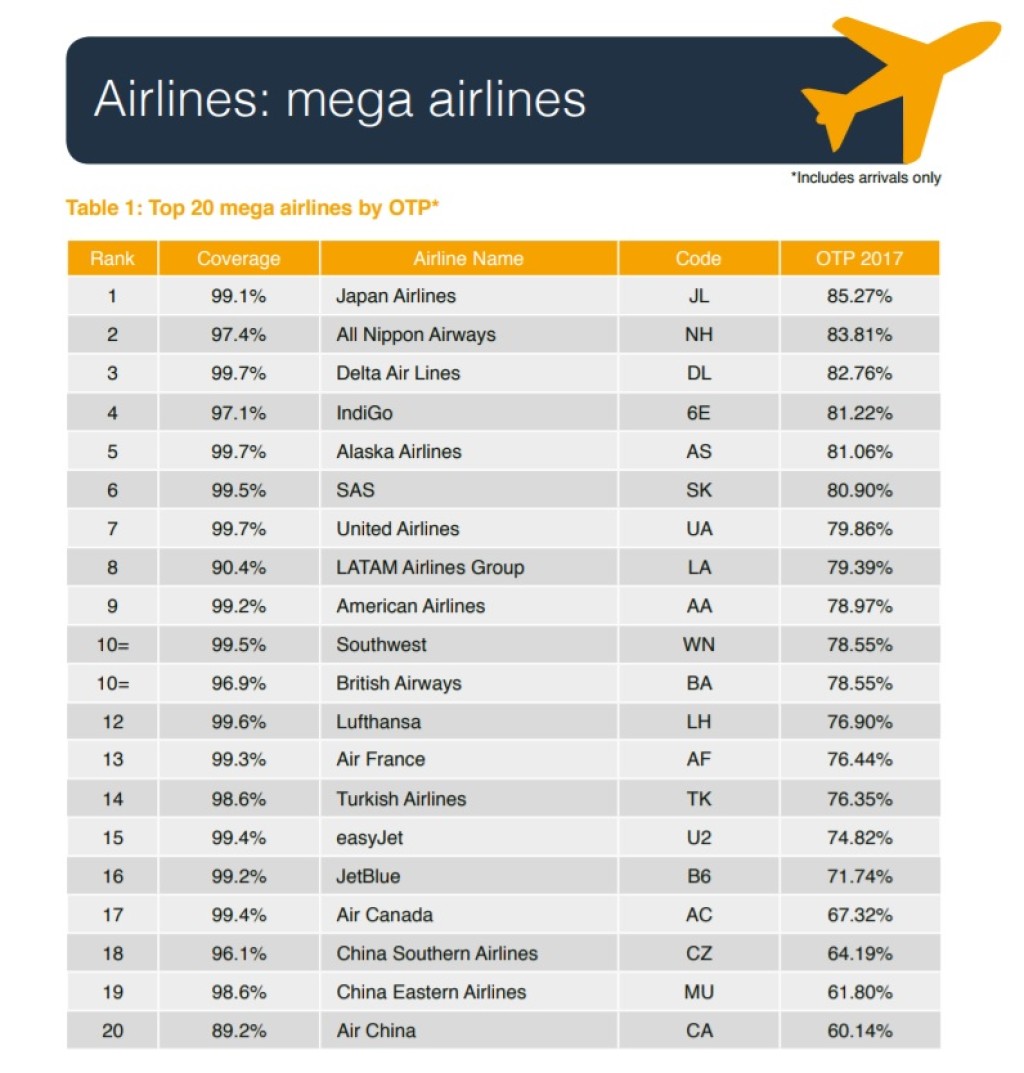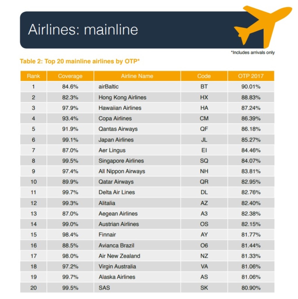 Maailma täpseim lennufirma 2017. aastal oli airBaltic, mille lendude väljumise ja saabumise täpsus eelmisel aastal oli 90,01%. AirBaltic osutus maailma täpseimaks ka 2015. aastal, kuid tookord oli nende lendude punktuaalsus oluliselt kõrgem ehk 94,39%.