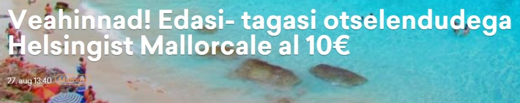 Veahinnad Helsingist Mallorcale alates 10€ Ryanairi superpakkumine: Tallinn-Barcelona-Tallinn 40€ KLMi edasi-tagasi lennupiletid sügisel ja talvel Tallinnast Balile 391€ (lisaks ka teised pakkumised Balile) Erinevad Ryanairi pakkumised Finnairil veahinnad Tallinnast Aasiasse: lennupiletid al 160€, Tai al 203€ Aeromexico veahinnad Amsterdamist Kesk- ja Lõuna-Ameerikasse al. 136€ Lennupiletid Tallinnast Korfu saarele 76€ Veahind: 14-päevane kruiis Aasias 0€ + maksud 200€ Luksuslik nädalavahetus Milanos - 3 ööd Hiltonis + lennupiletid Tallinnast 123€ Qatar Airwaysi hinnafestival