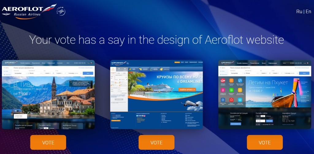 Aeroflot laseb veebilehe kujunduse otsustada reisijatel. Veebilehele aeroflotdesign.ru/en/ on välja pandud kolm veebilehe kujundust, millest üks on senine leht ja kaks uue kujundusega. Kahel uuel lehel tasub ka allapoole kerida. Hääletamine kestab kuni 14. septembrini. Muuhulgas pakutakse ka võimalust hääletada kõigi kujunduste vastu.
