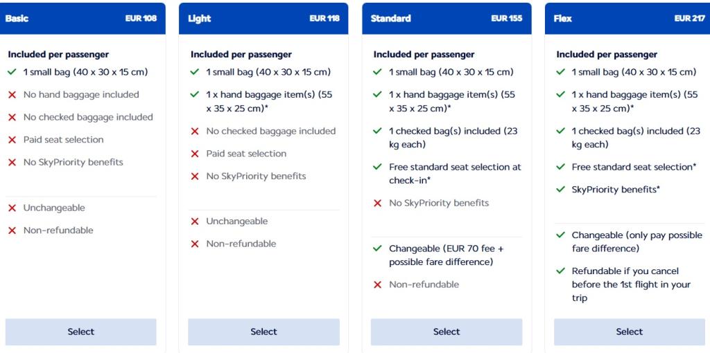 Air France ja KLM lisavad Euroopa sisestel lendudel senisele kolmele turistiklassi piletitüübile (Light, Standard, Flex) täiendavalt uue hinnatüübina Basic hinna. Sarnaselt odavlennufirmadele nagu Ryanair, Wizz Air ja Finnair kuulub Basic piletitüübi puhul hinna sisse ainult väike kott isiklike asjadega mõõtudega kuni 40 x 30 x 15 cm. Kes soovib reisida suurema käsipagasiga, peab valima kas kallima piletitüübi või ostma suurema käsipagasi lisaks hinnaga alates 15 eurot suuna kohta. Püsikliendiprogrammi Flying Blue Ultimate, Platinum, Gold ja Silver liikmetele on käsipagas endiselt tasuta ka uue Basic hinna puhul. Positiivne on, et ka Basic pilet sisaldab tasuta jooke, snäkke või einet.
