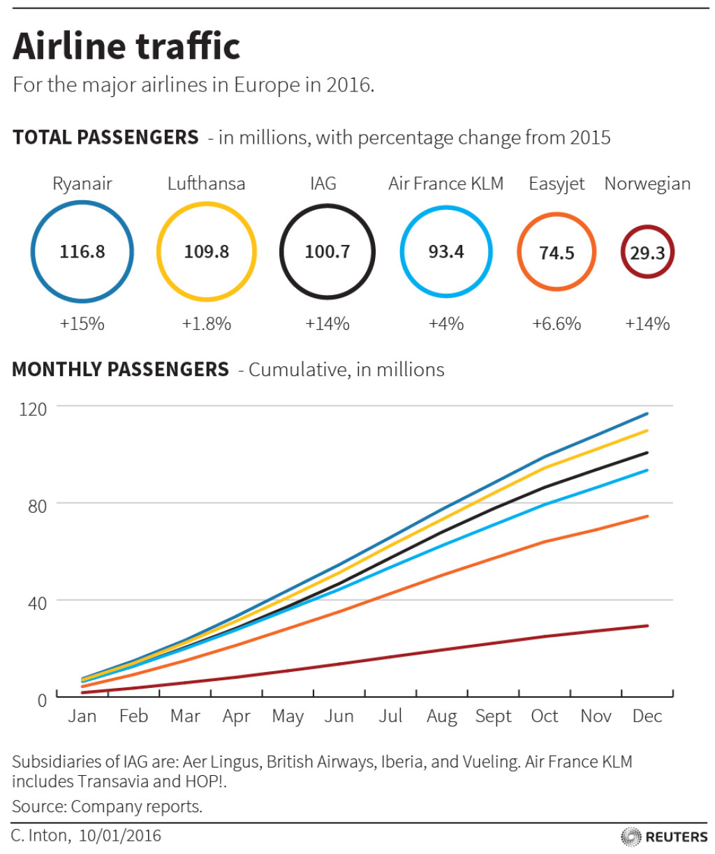 Aastaid Euroopa suurima lennufirma tiitlit hoidnud Lufthansa teatas kasvunumbritest ka 2016. aastal, kuid sellest ei piisanud, et saada vastu Ryanairile. Kui Lufthansa reisijate arv kasvas eelmisel aastal 1,8%, siis Euroopa suurim odavlennufirma Ryanair vedas 2016. aastal tervelt 15% rohkem reisijaid, kui aasta tagasi. Absoluutarvudes teeb see Lufthansal kokku 109,7 miljonit reisijat ja Ryanairil 117 miljonit reisijat aastas.