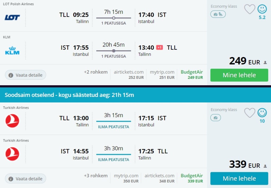 Hetkel on lennud Tallinnast Istanbuli broneeritavad (väljumine 30.10, tagasilend 31.10)