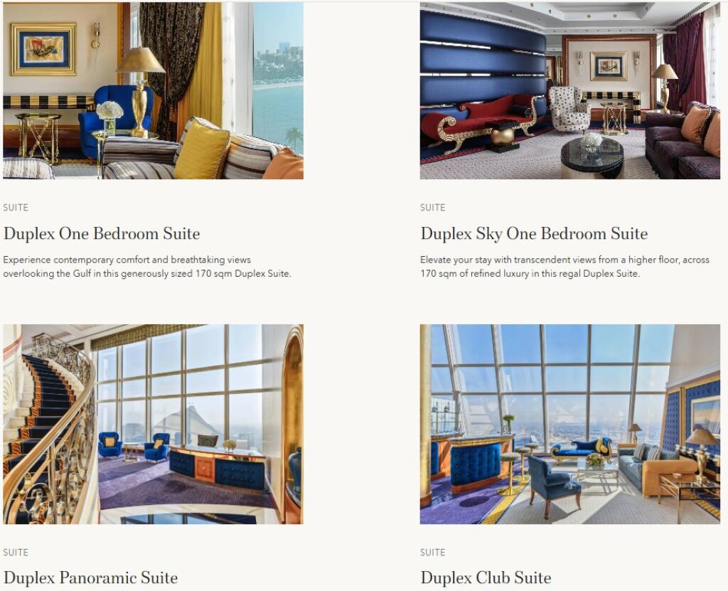 Burj Al Arab on hotell, kus tavalisi hotellitube polegi ja on ainult sviidid. Seejuures on iga sviit kahelkorrusel. See vähendab küll oluliselt tubade koguarvu, kuid see-eest saavad külastajad tavalise hotellikeskkonna aseme nautida pigem privaatse palee taolist tunnet.