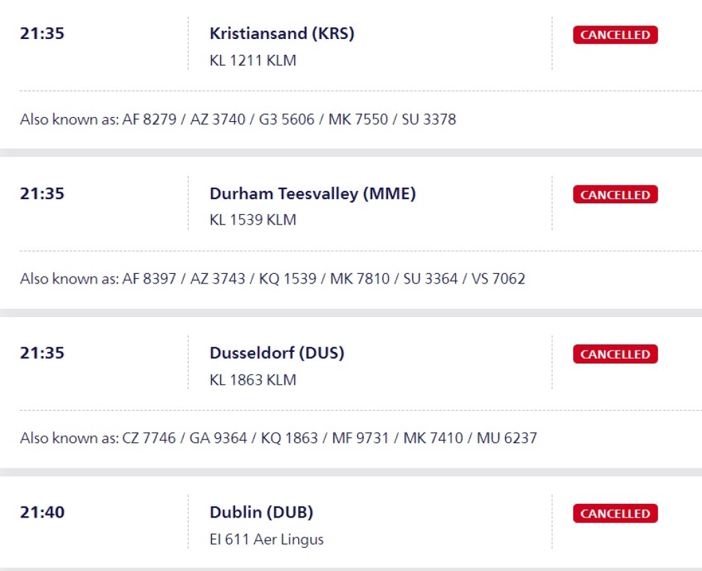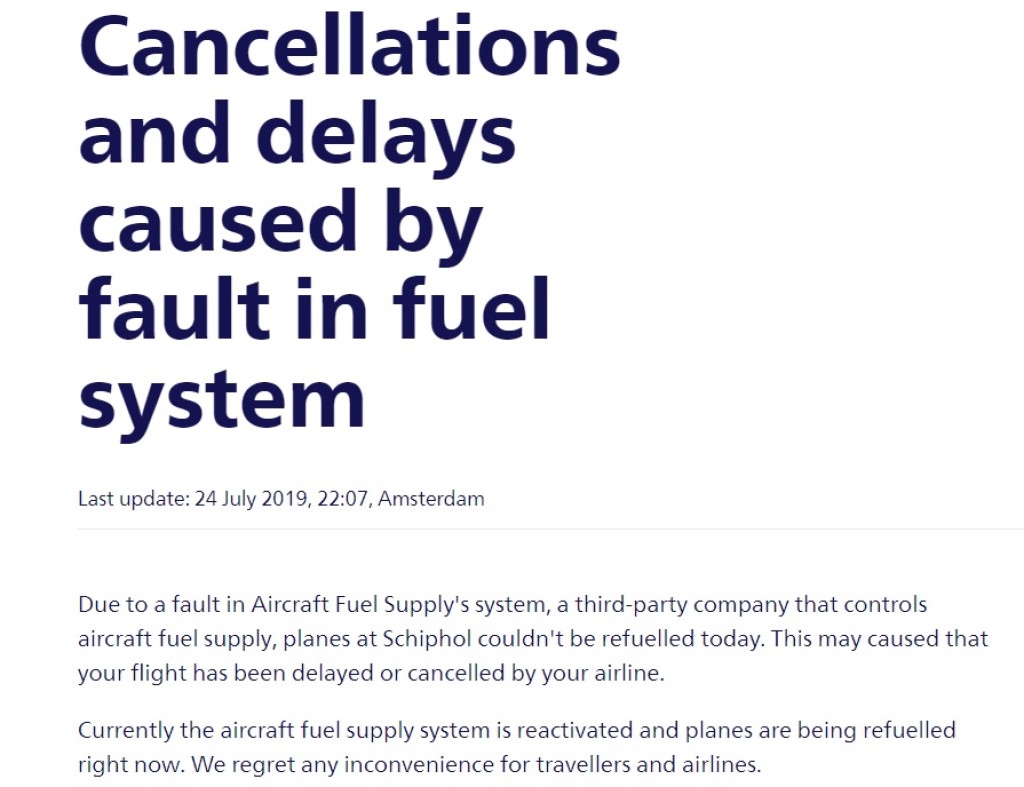 Osad lennufirmad suunasid probleemi ilmnedes lennukid ümber teistele lennuväljadele. Mitmed kauglennud maandusid Amsterdami asemel näiteks Brüsselis, Düsseldorfis või isegi London Gatwickis. Vähemalt 250 lendu tühistati ja üle 400 lennu hilines. Et lennujaama lähedal asuvad hotellid olid enamasti juba täis (suvine reisimise tipphooaeg ikkagi), siis organiseeriti reisijatele lennujaamas magamiseks vähemalt 6000 välivoodit, kuid sellestki jäi vist väheks. Ja nagu arvata võib, on lennujaamas ööbima sunnitud reisijad maruvihased.