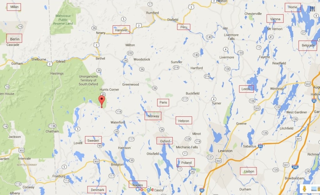 Selgub, et see kant Maine’i osariigis on tihedalt täis pikitud linnadega, mis on oma nimed saanud erinevate riikide ja linnade nimede järgi. Kas siin võib olla tegemist vihjega, et linnade kunagised asukad kannatasid paremate ideede puuduse käes? Näiteks ei leia Maine’is asuvast Pariisist (elanike arv 5187) mitte ühtegi prantsuse keele kõnelejat. Kuid selgub, et linnale sellise nime panijad teadsid hästi, mida tegid.