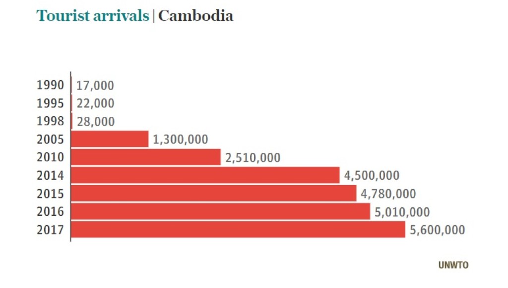 Kui vaadata turistide arvu suhtelist kasvu, siis ei ole ükski riik maailmas kogenud sellist turismibuumi, kui Kambodža. Kui 1990. aastal külastas Punaste khmeeride hirmutegude järellainetuses elavat riiki kõigest 17 000 turisti, siis 2016. aastal saabus Kambodžasse 5,01 miljonit välisturisti ehk 26 aastaga on toimunud 32 941 protsendiline kasv.