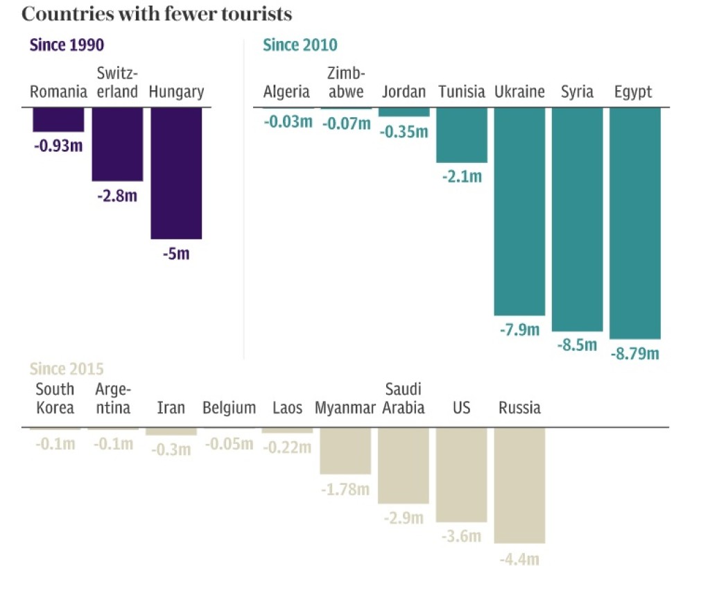 Riigid, kus turism on viimastel aastatel vähenenud, kannatavad kas sõja, rahutuste või terrorismi käes. Ukrainas, Tuneesias, Egiptuses ja Süürias toimunut teavad ilmselt kõik.