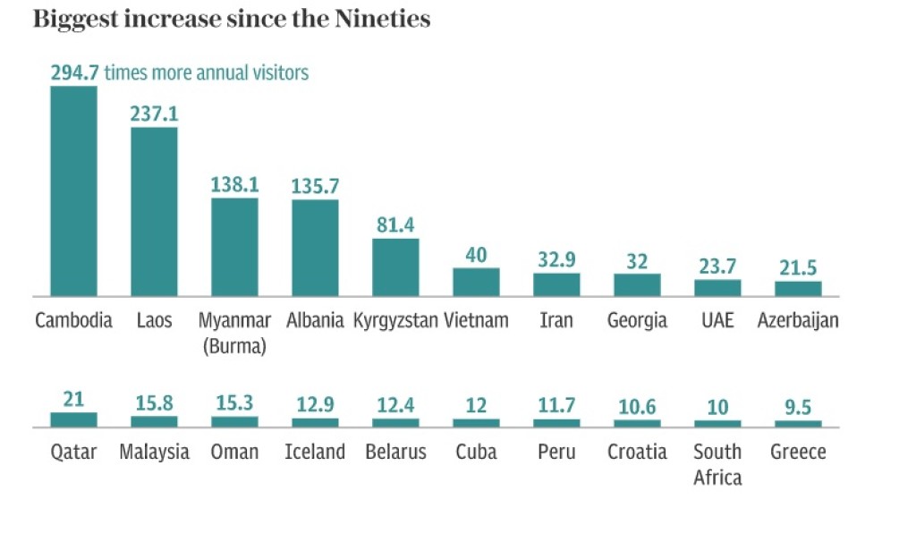 Kuid nendest numbritest ehk huvitavamgi on vaadata, kuidas on rahvusvaheline turism kasvanud võrreldes 1990ndate aastatega. Briti väljaanne Telegraph on UNWTO andmete põhjal kokku pannud huvitava statistika, missugused sihtkohad on viimase paari-kolmekümne kümne aastaga kogenud kõige suuremat turistide arvu kasvu.