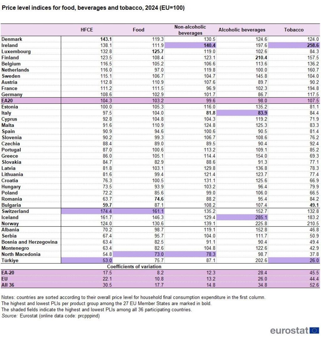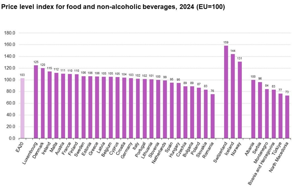 Kõige odavamad riigid toidu ja mittealkohoolsete jookide ostmiseks on Põhja-Makedoonia (73% EL keskmisest), Türgi (77%) ja Rumeenia (76%). Soodsad on ka Slovakkia ning Bosnia ja Hertsegoviina, kus hinnatase on EL keskmisest 17% soodsam. Järgnevad Montenegro (-16%) ja Poola (-13%). Eestis oli toit 2024. aastal 6% EL keskmisest kallim.