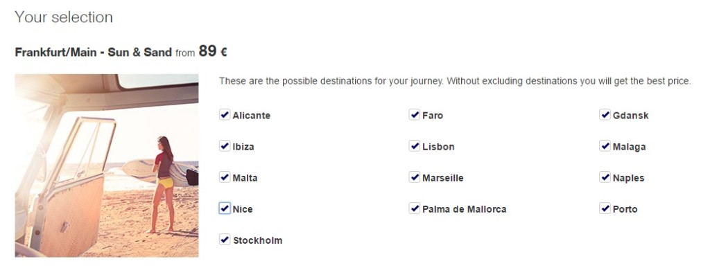 Lufthansa on sihtkohad jaganud 9 kategooriasse: lenda itta, vaatamisväärsused&kultuur, loodus, päike ja liiv, bromance (tõsiselt, kas sellised linnad on olemas?), suurlinnad, peokohad, romantika ja ostlemine. Pakutavad sihtkohad Frankfurdist ja Münchenist on mõnevõrra erinevad ja kohati natuke ootamatud. Näiteks klassifitseerub Stockholm nii Frankfurdist kui Münchenist välja lennates päikese ja liiva alla, olles ühtlasi hea koht ka loodussõpradele. Loodus on Lufthansa arvates kaunis ka Kopenhaagenis.