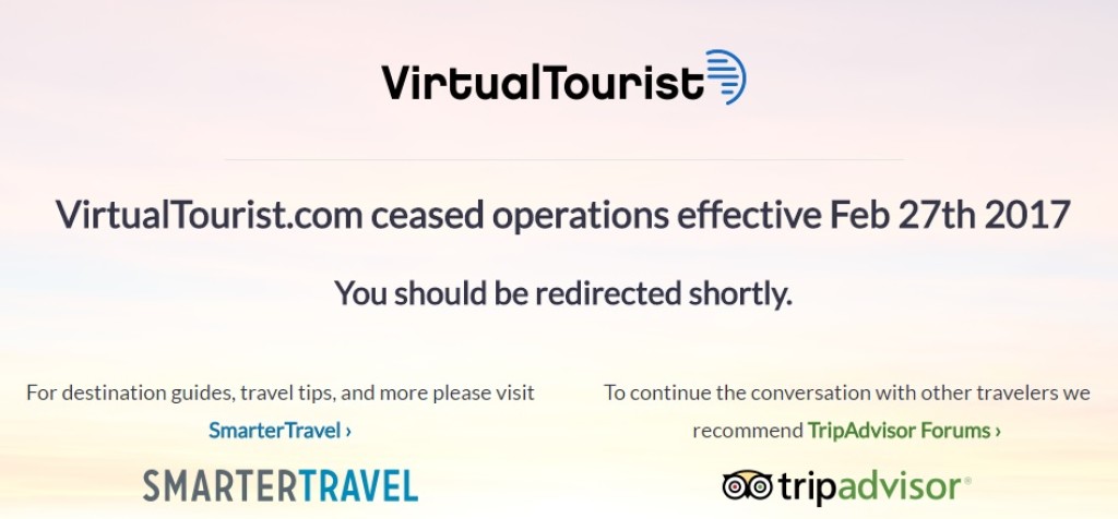 Toodud info Tripadvisori kohta on veidi ebatäpne, sest mitmed tuntud veebilehd on tänaseks kas suletud või sulgemisel. Vähe staažikamatele reisijatele nii tuttav VirtualTourist, mis sisaldas kasutajate reisinõuandeid ja reisifoorumeid, on tänaseks suletud.