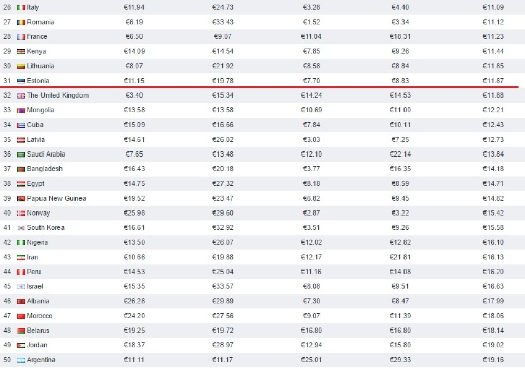 Veidi üllatuslikult on Läti Eestist kallim (35. kohal), kuigi arvestades Riiga lendavate odavlennufirmade arvu ja Ukraine Internationali pidevalt soodsaid hindu, oleks arvanud, et Läti on kokkuvõttes odavam (odavlendude hinnakilomeeter tegelikult ongi). Küll aga poleks oodanud, et Soome maandub peaaegu täiesti tabeli põhjas.