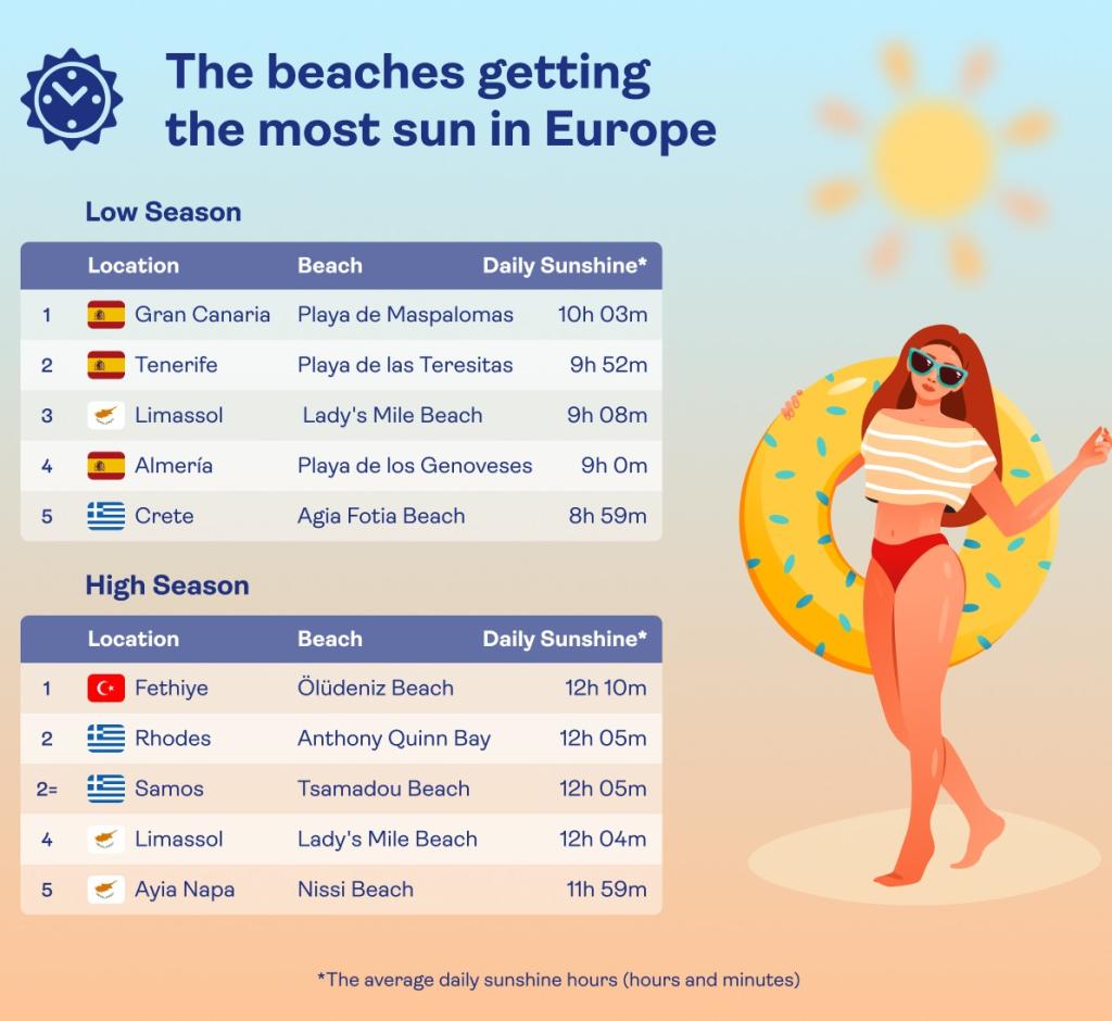 Küsimus, kust võiks Euroopas talveperioodil päikest otsida, on vähemalt sama vana kui Trip.ee. Brittide 50+ vanuserühmale reise korraldav Saga Travel vaatas statistikat, kui palju on viimasel kolmel aastal Euroopa rannakuurortites keskmiselt olnud päikeselisi tunde ja missugused on olnud keskmised temperatuurid nii kõrg- kui madalhooajal. Tulemused on siin: