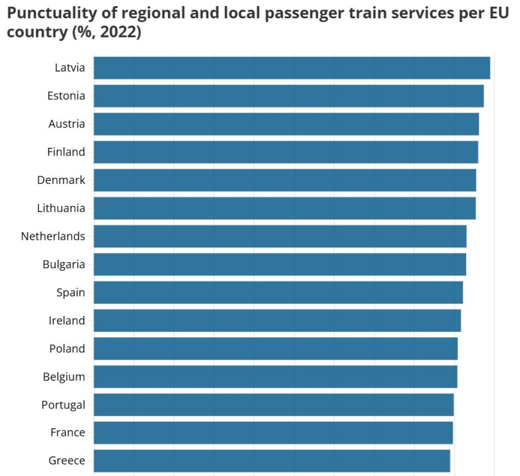 Euroopa Liidus on kõige täpsemad kaugrongid Hollandis ja Belgias, kus 2022. aastal saabus 88% rongidest plaanijärgselt. Vaid minimaalselt jäid maha Bulgaaria (87%) ja Taani (85%). Hispaania oli 84% viiendal kohal, kuid tõepoolest eespool nii Saksamaast, Itaaliast kui Prantsusmaast.