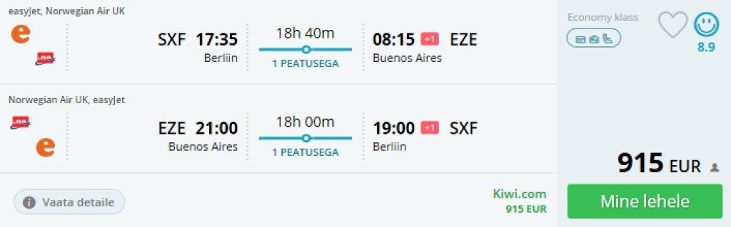 Sama muster kordub, kui võrrelda Berliin Schönefeld – Buenos Aires edasi-tagasi pileteid. GatwickConnectsil on oma hind.