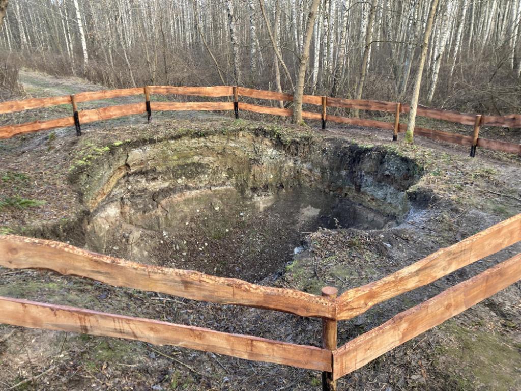 Salaspilsi karstialale tekkinud lehter on ebatavaline ka oma asukoha tõttu. Maapinna varing toimus otse metsateel, mida mööda kulges kunagi Zeltiņi kipsikaevandusi praeguse Salaspilsi jaamaga ühendava kitsarööpmelise raudtee tamm. Raudtee rajati sinna umbes 120 aastat tagasi, kuid selle kasutamine lõpetati 1965. aastal.