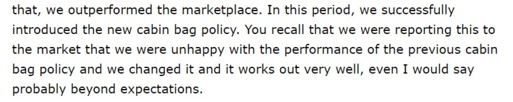 Ryanair ja Wizz Air on ilmselt otsustanud kombata, kaugele neil minna lastakse. Vähemalt Wizz Airi puhul on täiesti selge, et jutt ei käi pardalemineku kiirendamisest, vaid täiendava kasumi teenimisest. Kommenteerides 2018-2019 majandusaasta III kvartali (oktoober-detsember) tulemusi, märkis Wizz Air i tegevjuht József Váradi, et lennufirma polnud rahul senise pagasipoliitikaga, kuid alates novembrist kehtivad pagasitasud on ületanud ootusi.