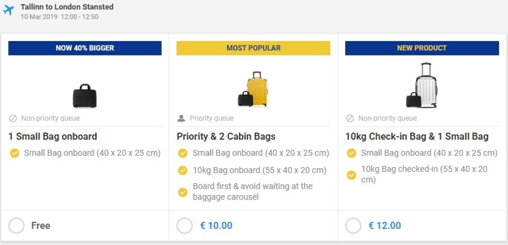 Alates 1. novembrist kord muutus ja väiksema reisikohvri pardale kaasavõtmine muutus tasuliseks. Kõige soodsam variant reisikohvri pardale võtmiseks on osta eelisjärjekorras pardaleminek ehk priority boarding, mis lisab Tallinnast või Tallinnasse lennates lennusegmendi hinnale piletit broneerides 8-10 eurot ja kaugelt rohkem, kui seda teha hiljem lennule letis registreerides või väravas. Ryanair põhjendas seda tasu vajadusega kiirendada pardaleminekut. Wizz Air üldiselt lihtsalt kopeerib Ryanairi pagasipoliitikat, kuid on Ryanairist veelgi ahnem.