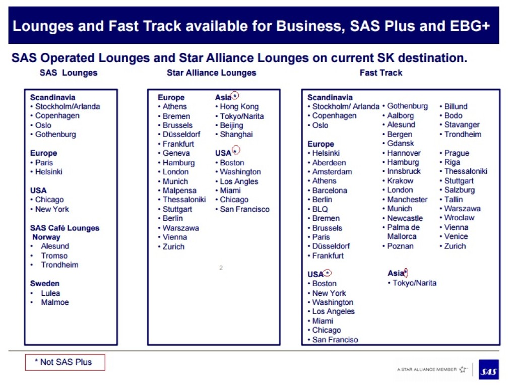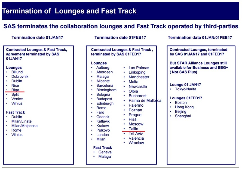 SAS Plus-i üks müügiargumente on olnud võimalus kasutada äriklassi ootesaali ja läbida lennujaamade turvakontroll eraldi liini pidi (fast-track). Alates uuest aastast kaovad need võimalused paljudes SAS-i sihtkohtades ära, sest SAS lõpetab tervelt 47 lennujaamas juurdepääsu lepingulistesse lounge’idesse. See tähendab, et SAS-i premium kliendid saavad jätkuvalt kasutada SAS-i enda ja Star Alliance’i lounge’i lennuväljadel, kus need olemas on, kuid lepingulistesse loungidesse enam asja ei ole. Muuhulgas tähendab see näiteks seda, et Tallinast (jah, SAS-i jaoks on Eesti pealinn Tallin) ja Riiast SAS Plus piletiga lendajad äriklassi ootesaali enam ei pääse.
