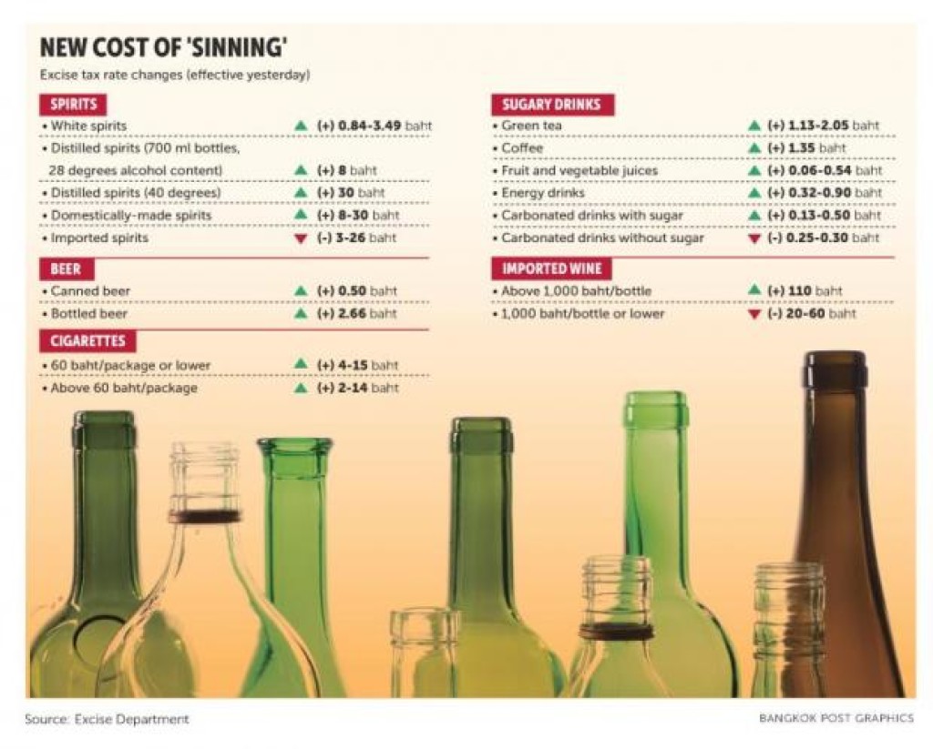 Alates septembri keskpaigast jõustusid Tais ka uued aktsiisimäärad, mis tõstsid mõnevõrra alkoholi, karboniseeritud jookide ja sigarettide hindu. Kõige enam kallinesid paremad importveinid, mis maksavad üle 25€.