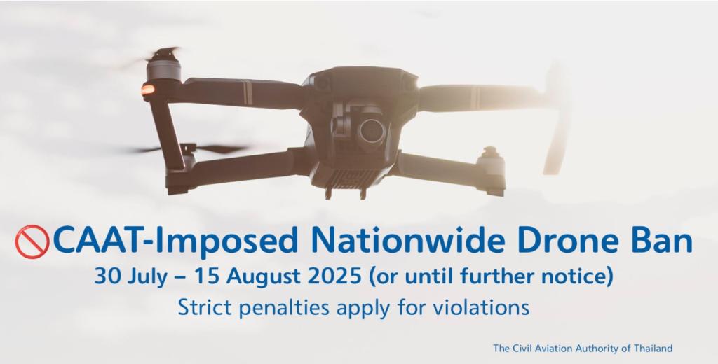 Tai – Kambodža piiritülil on reisijatele vähemalt üks otsene tagajärg – turvakaalutlustele viidates keelas Tai lennuamet CAAT terves riigis ajutiselt igasuguse droonilennutamise. Droonide lennukeeld on esialgu jõus kuni 15. augustini 2025 ning puudutab kõiki eradroone, olgu neil peal kaamera või mitte. Keelu rikkujaid ähvardab kuni 40 000 THB (~1070€) suurune rahatrahv või halvemal juhul isegi vanglakaristus.