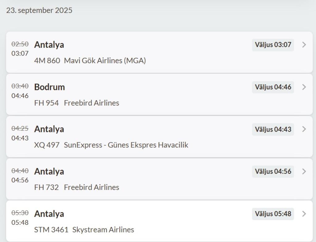 Tundub, et huvi Türgi puhkusereiside vastu on Eestis tõesti suur. Nii väljus täna varahommikul Tallinnast Türgi suunas väikeste vahedega tervelt viis lendu. Neli neist viis Antalyasse, üks Bodrumisse. Ainus regulaarlend toimus SunExpressiga, ülejäänud neli olid tšarterlennud.