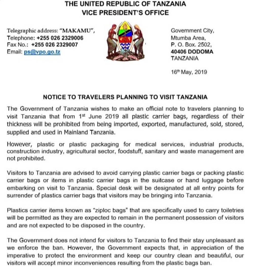 Nagu väljastatud infost võib lugeda, soovitatakse Tansaaniasse reisijatel hoiduda käsi- või äraantavas pagasis kilekottide kaasavõtmisest ning asjade nende sisse pakkimisest. Tansaania piiripunktides seatakse sisse võimalus kaasatoodud kilekotid ära anda. Lubatuks jäävad lukustatavad kilekotid, mis on mõeldud tualett-tarvete kaasavõtmiseks.