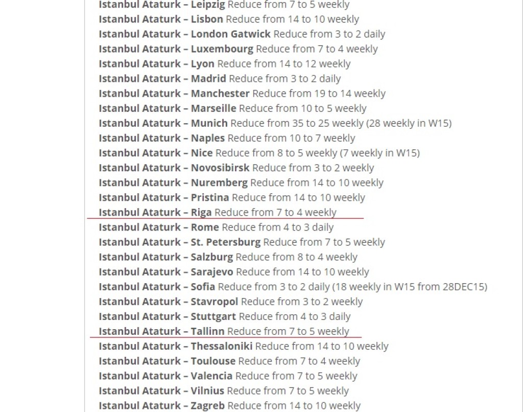 Kust siis kokku tõmmatakse? Eelkõige puudutavad kärped Euroopasse suunduvate lendude sagedusi. Ülevaate leiab Routesonline lehel. Muuhulgas vähendatakse alates oktoobri lõpust sagedusi ka lendudel Istanbulist Tallinnasse, Riiga ja Vilniusesse. Tallinnast Istanbuli toimuvad lennud talvel praeguse 7 korra asemel 5 korda nädalas (ETNRP), Riiast Istanbuli saab talvise lennuplaani kohaselt 4 korda nädalas (ENRP). Praegu on sealgi lennud iga päev. Vilniusesse hakatakse 7 korra asemel lendama 5 korda nädalas. Helsingis mahte vähendada ei plaanita.